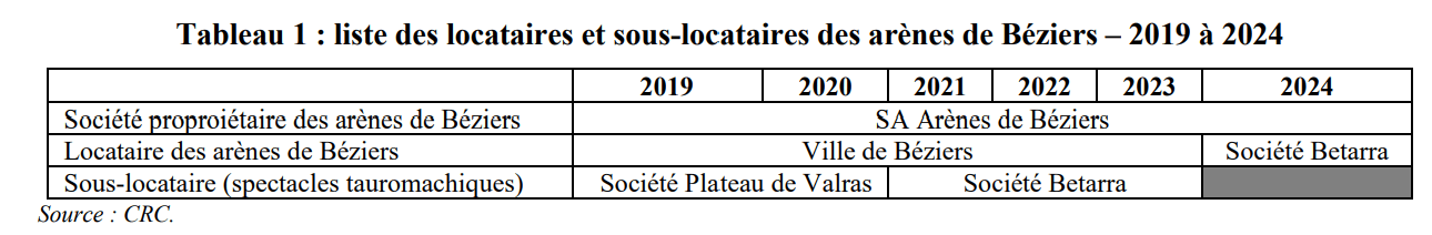 Les arènes de Béziers n’appartiennent pas à la Ville, mais à une société anonyme privée (la SA des Arènes), regroupant quelques actionnaires. De 2019 à 2023, la commune a loué les arènes à leur propriétaire, puis les a sous-louées à des sociétés privées organisatrices de corridas (SA Plateau de Valras, puis SA BETARRA). La CRC souligne que ce montage a coûté cher à la collectivité, qui a payé un loyer annuel, alors que les arènes n’étaient utilisées que pour les corridas de la feria. Il s’agit ici du coût net pour la Ville (loyers versés, déduction faite des loyers perçus et exonérations accordées).