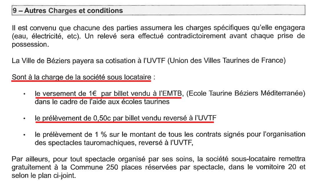 Le bail de sous-location signé avec la municipalité de Béziers lui donne d’ailleurs la possibilité d’organiser des spectacles sans aucun lien avec la tauromachie puisqu’il stipule : « De manière accessoire, la société [Betarra] pourra organiser des spectacles non-tauromachiques sous la condition qu’elle ait obtenu l’accord express de la Commune pour l’organisation de ces spectacles, et sous réserve de solliciter cet accord au minimum un mois avant la date prévue. »