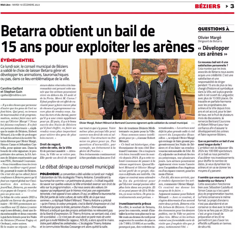 Dès le 1ᵉʳ janvier 2024, la société BETARRA sera la nouvelle locataire des arènes, suite à la délibération votée par le Conseil municipal le 18 décembre 2023. Cette décision, formalisée par la nouvelle « Convention de Partenariat et d’engagements réciproques pour l’occupation et la gestion des arènes de Béziers », confère à BETARRA l’exclusivité de la gestion des arènes pour une durée de 15 ans et les quasi pleins pouvoirs pour organiser des corridas ainsi que d’autres événements non tauromachiques (culturels, artistiques, sportifs, etc.). La commune conserve seulement un « droit de regard et de veto » sur les spectacles programmés et la possibilité d’organiser des évènements sans frais de location.