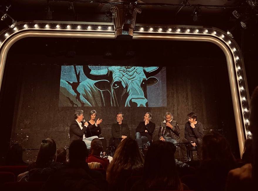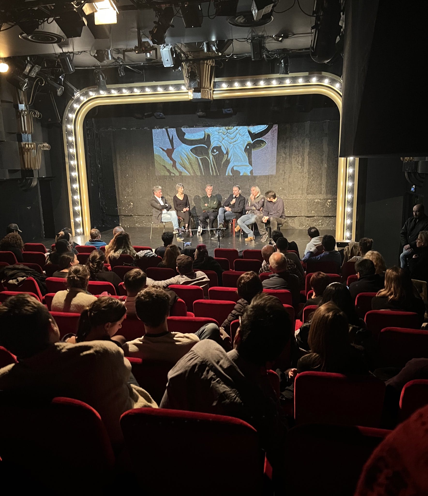 Avec Claire Starozinski, présidente de l’Alliance Anti corrida), la député LFI de l’Hérault Nathalie Oziol et Sophie Maffre-Baugé, présidente du COLBAC, face à Benjamin Cuillé, éleveur de taureau de corrida, Marion Mazauric, éditrice au Diable Vauvert, et le député de l’Hérault Renaissance Patrick Vignal.