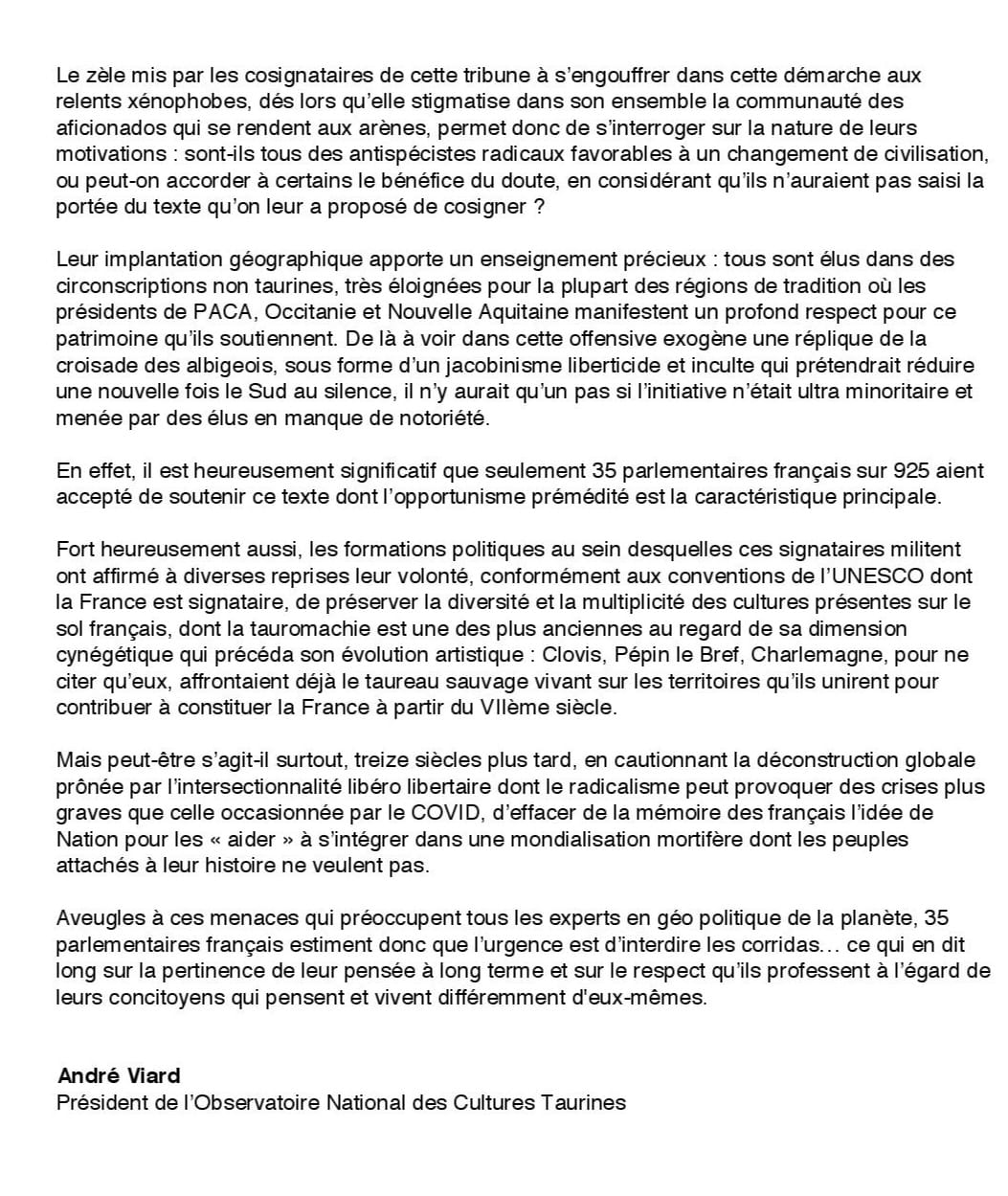 L’Observatoire National des Cultures Taurines (ONTC), sous la plume de son président André Viard, a réagi dans un communiqué par la sempiternelle litanie des arguments fallacieux et grotesques, quasi risibles s’il ne s’agissait pas d’un sujet grave, en l’occurrence la violence banalisée et légalisée envers des animaux. C’est une nouvelle démonstration qu’aucun argument objectif et rationnel n’est, évidemment, en mesure de justifier la cruauté des corridas. Nous publions ce communiqué (ci-dessous) car il sert en réalité notre cause tant la teneur de son propos est délirante.