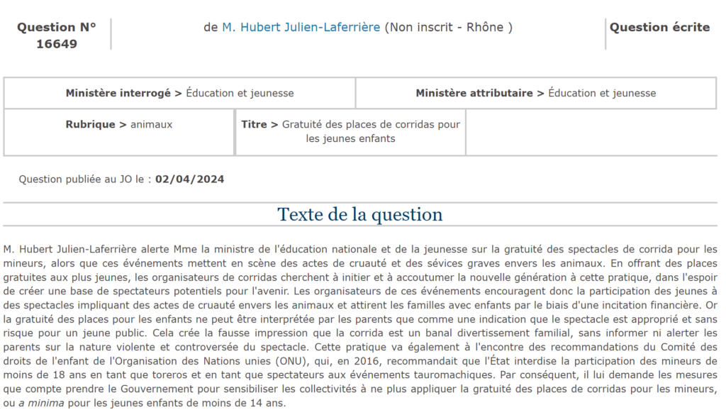 Suite à nos sollicitations, le député du Rhône, Hubert Julien-Laferrière (Non inscrit), interroge la ministre de l’Éducation nationale et de la jeunesse sur la gratuité des spectacles de corrida pour les mineurs, alors que ces événements mettent en scène des actes de cruauté et des sévices graves envers les animaux.