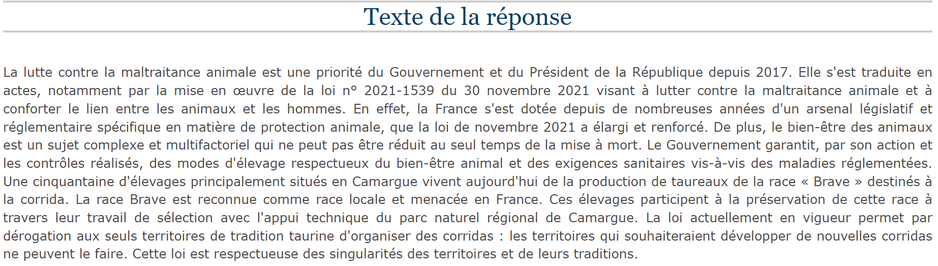 La réponse du ministre de l’Agriculture est malhonnête, car elle ne répond pas à la question posée par le député Vincent Ledoux et élude totalement la question de la violence infligée aux animaux lors des corridas. Le ministre mentionne que le bien-être animal ne se résume pas à la mise à mort : il fait allusion à l’élevage des taureaux de race brave, ce qui n’a aucun rapport avec la question. Le ministre indique par ailleurs que la race brave est « menacée en France ». Le taureau de corrida n’est absolument pas en voie de disparition ! Si les élevages connaissent, en effet, de sérieuses difficultés économiques, cela est une conséquence de la cruauté des corridas qui rend ces dernières impopulaires et rejetées par l’immense majorité des citoyens. Enfin, il affirme que la loi en vigueur interdit aux territoires non concernés par la dérogation de développer de nouvelles corridas et que cette loi est « respectueuse des singularités des territoires et de leurs traditions ». Respectueuse de l’animal aussi ?
