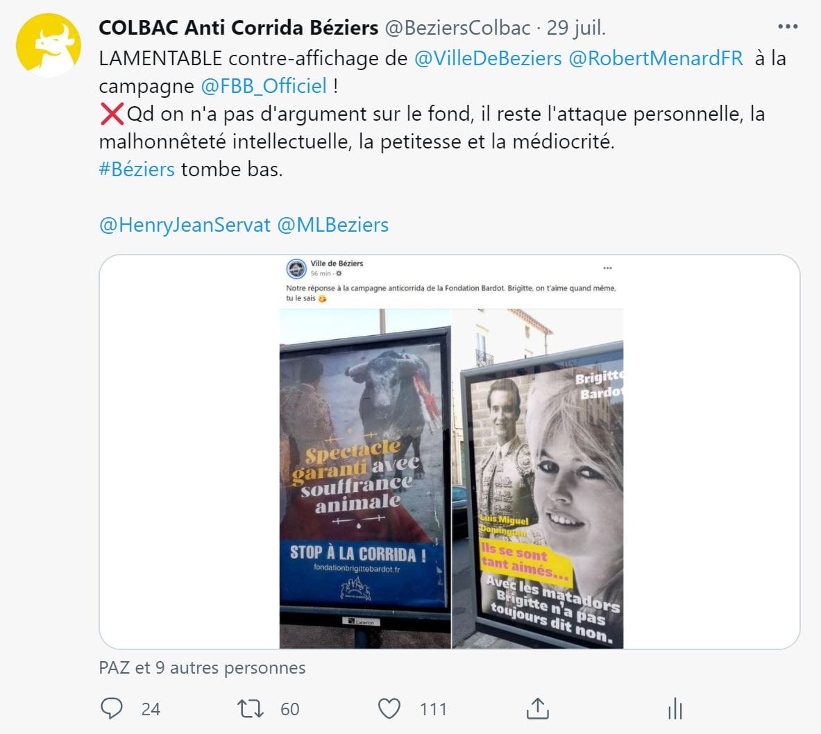 En réponse à cette campagne, la municipalité a placardé des contre affiches qui attaquent l’actrice Brigitte Bardot sur sa vie intime, en mentionnant une liaison qu’elle aurait eue avec un torero : « Ils se sont tant aimés…Avec les matadors, Brigitte n’a pas toujours dit non. »