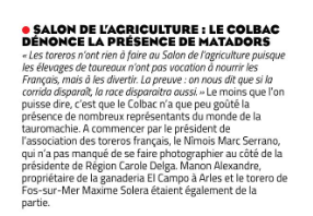 Le COLBAC a dénoncé la présence des toreros au Salon de l’agriculture. Les toreros n’ont rien à y faire puisque les élevages de taureaux n’ont pas vocation à nourrir les Français, mais à les divertir. Pour preuve : les défenseurs de la corrida affirment que si la corrida disparait, la race des taureaux « braves » disparaitra aussi.