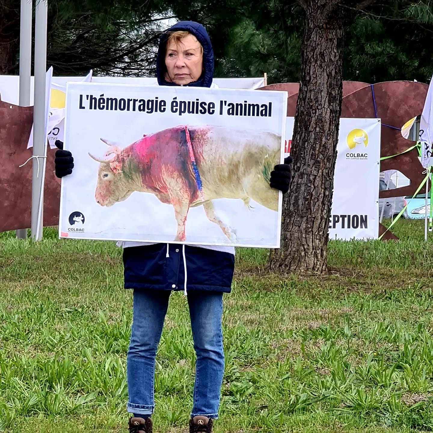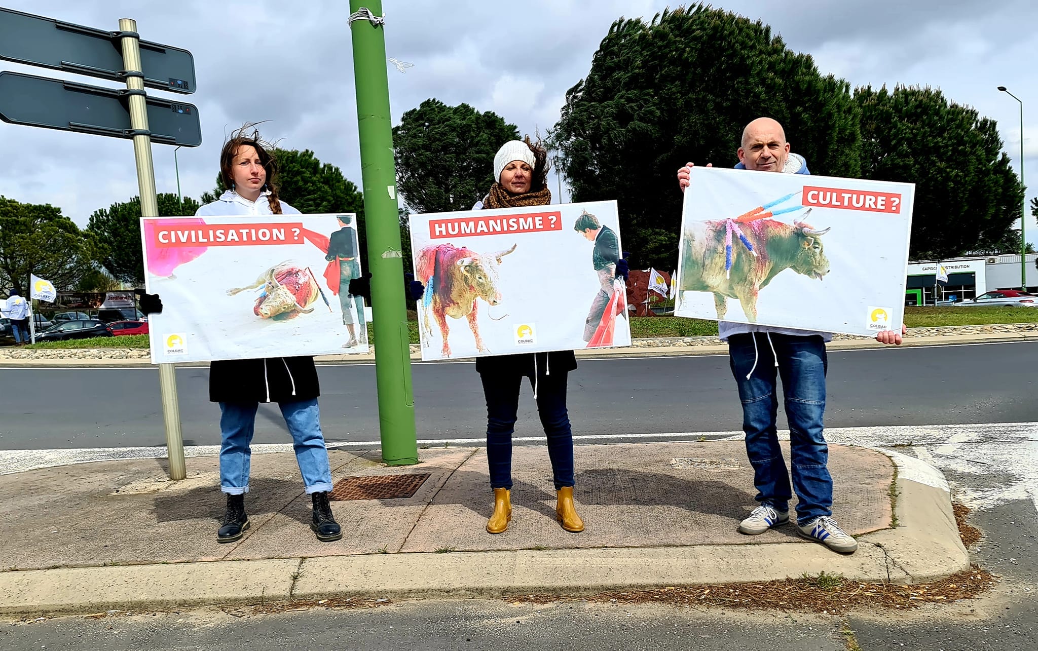 Postés aux entrées du rond-point situé sur la D28 (route de Bessan), au niveau de la zone commerciale très fréquentée de la Giniesse, nous avons montré des photos de taureaux victimes des corridas.