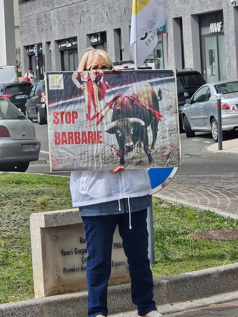 Pendant deux heures, les militants ont brandi des visuels et distribué des tracts pour dénoncer la corrida et la cruauté qu’elle implique.