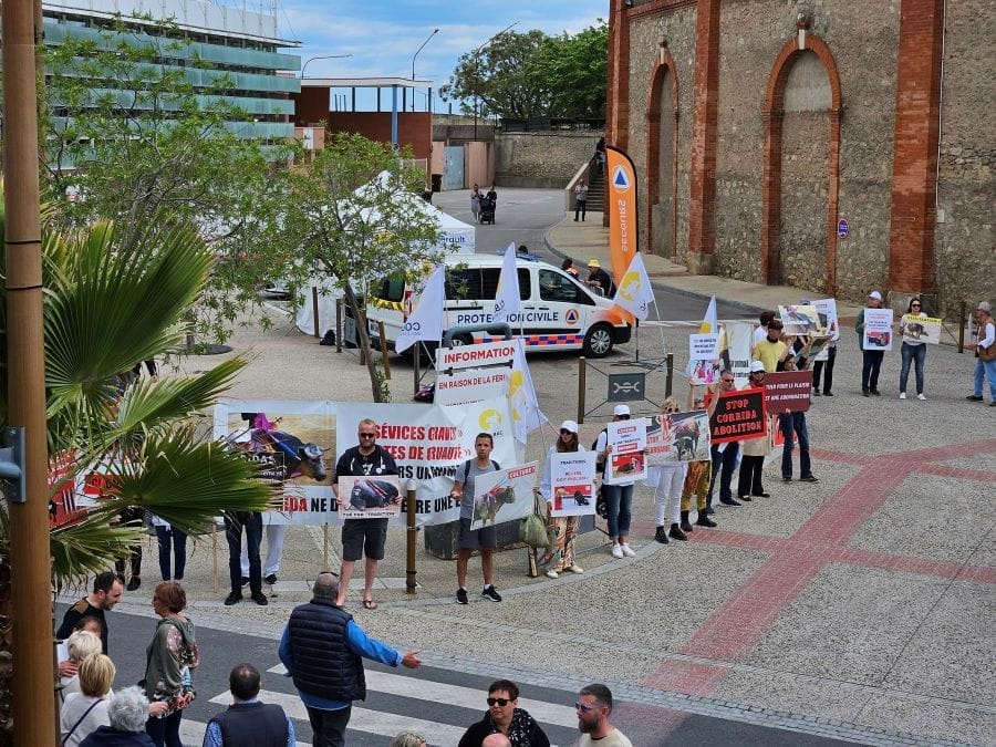 Le COLBAC a manifesté devant les arènes au moment où le public se rendait à la novillada du gala Christian Coll.