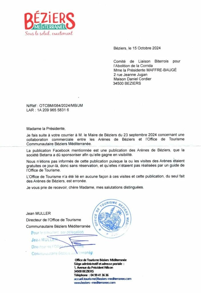 Dans une lettre datée du 15 octobre 2024 qu’il nous a adressé, Jean Muller, directeur de l’Office de Tourisme Béziers Méditerranée, a réfuté toute implication de l’Office dans les visites des arènes ou la publication Facebook de Betarra. Il précise :