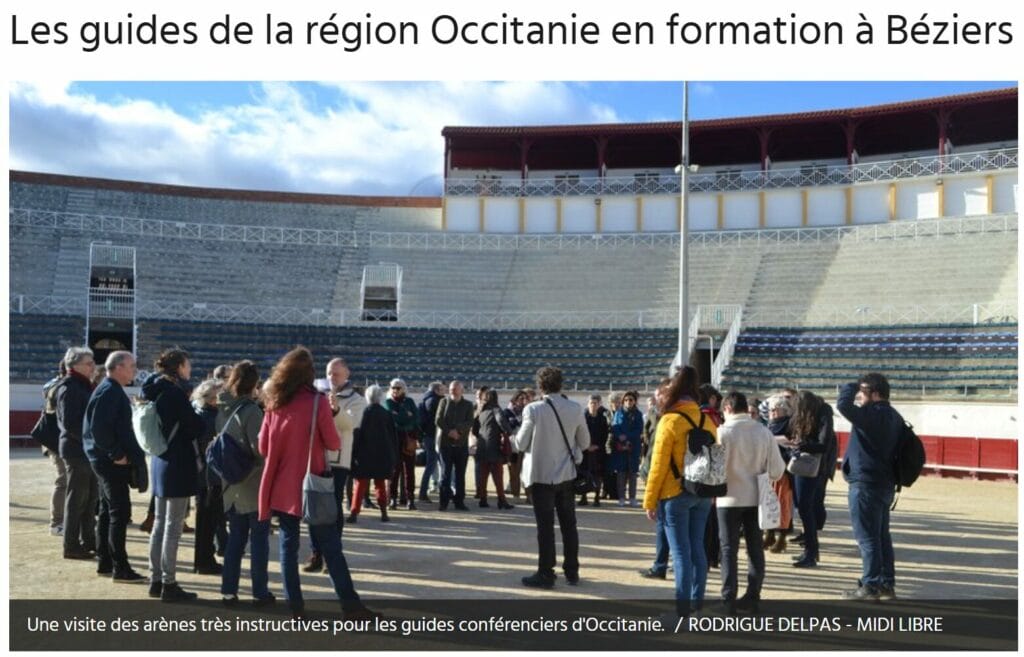 En novembre 2023, un article du Midi Libre rapportait une formation organisée à Béziers pour les guides touristiques de la région Occitanie. Cette formation incluait une sensibilisation au « patrimoine des arènes et de la corrida ». Le programme comportait trois volets : une présentation « patrimoniale » des arènes, une intervention de Diego Alcalde, représentant de l’Union Taurine Biterroise, visant à expliquer et défendre la corrida, et une démonstration de tauromachie réalisée par des élèves de l’école taurine Biterroise. L’objectif affirmé était de permettre aux guides d’avoir une meilleure connaissance de la corrida… tout en évitant, soi-disant, de porter des jugements lorsqu’ils transmettent cette information (!).
