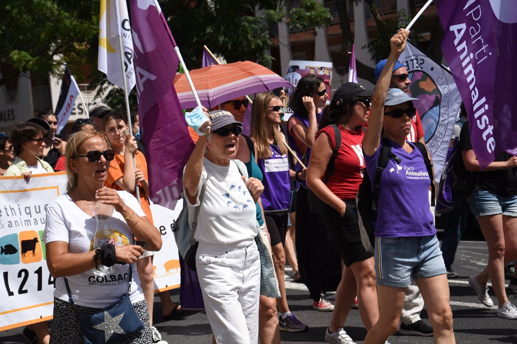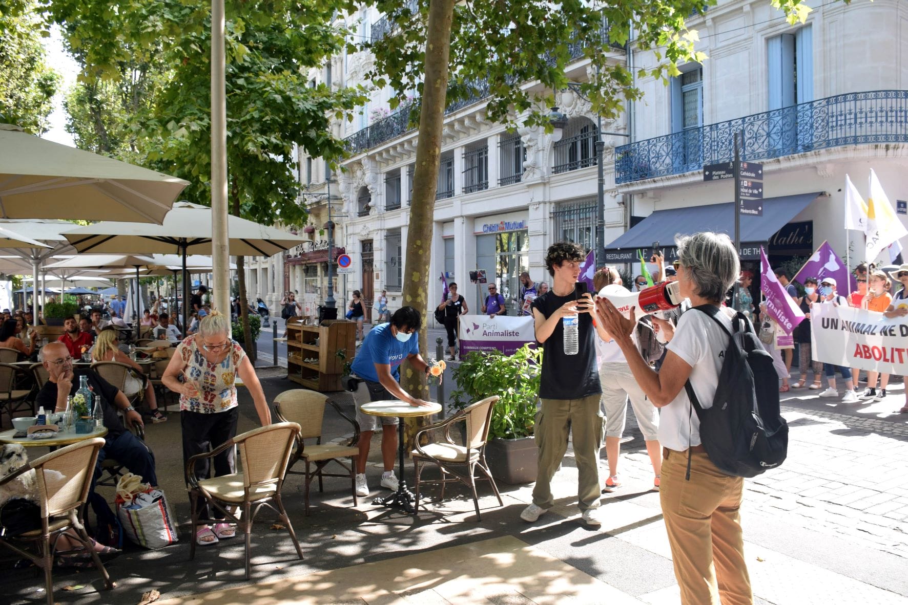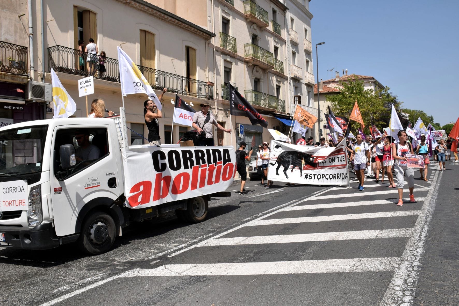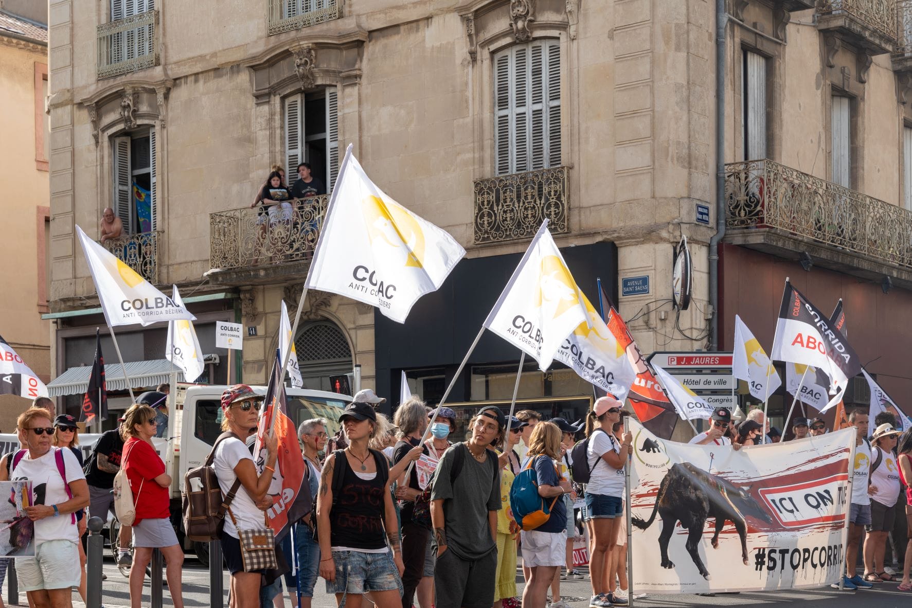Notre cortège, précédé d’une grande banderole « Un animal ne devrait jamais être torturé, abolition des corridas ! « et d’un camion flanqué de drapeaux et banderoles aux couleurs du Colbac, s’est élancé du haut de l’avenue Clémenceau jusqu’à la place Jean Jaurès, en passant par l’hôtel de ville et la permanence d’Emmanuelle Ménard. Nous avons souhaité également mettre à l’honneur la campagne d’affichage de la Fondation Brigitte Bardot en passant devant une affiche « Spectacle garanti avec souffrance animale – Stop à la corrida.