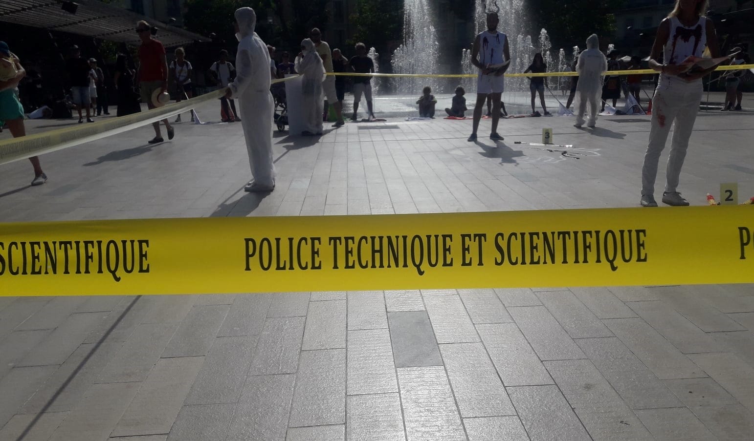 La manifestation s’est poursuivie par la reconstitution symbolique d’une scène de crime. Au sol, des silhouettes symbolisant les victimes et les armes, réelles et non factices, utilisées au cours des corridas pour torturer et mettre à mort les taureaux : une pique (dont nous avons oublié d’enlever le capuchon protecteur !), des banderilles, une épée et un poignard. Au centre, 4 militants-taureaux, habillés en blanc pour symboliser l’innocence et la paix, ont effeuillé, l’un après l’autre, la plainte douloureuse d’un taureau supplicié dans une arène.