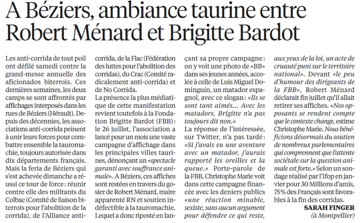 15/08/21 Libération Corridas : À Béziers, ambiance taurine entre Robert Ménard et Brigitte Bardot