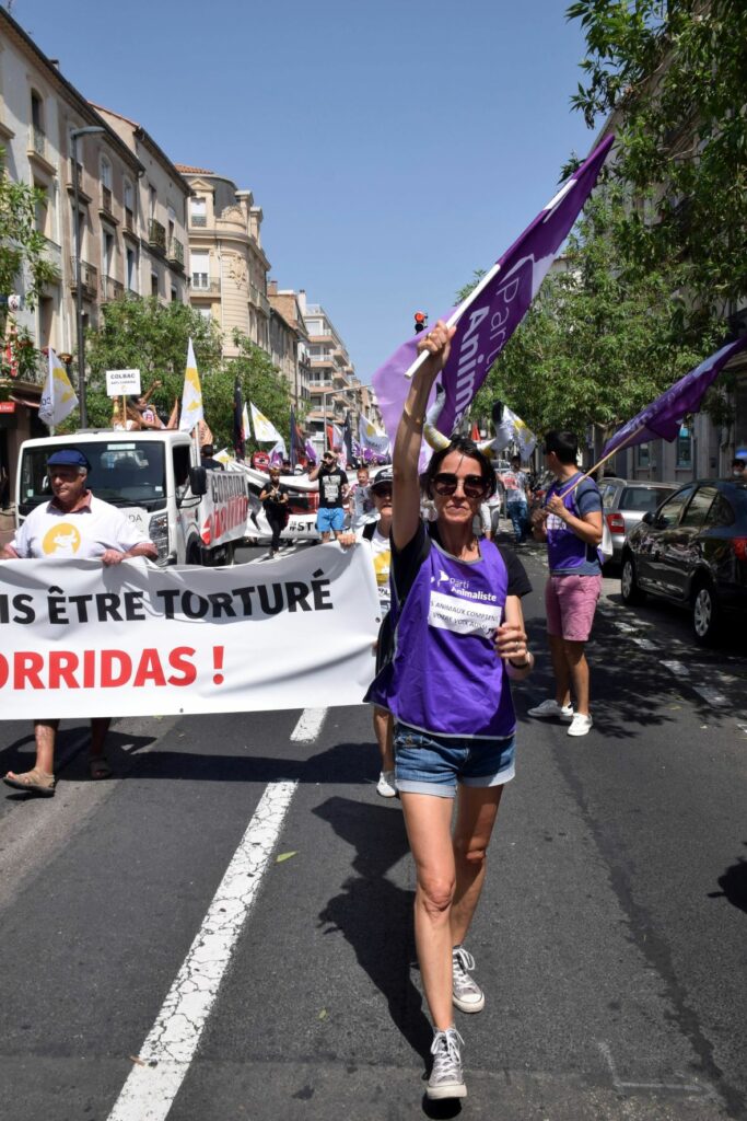 Notre cortège, précédé d’une grande banderole « Un animal ne devrait jamais être torturé, abolition des corridas ! « et d’un camion flanqué de drapeaux et banderoles aux couleurs du Colbac, s’est élancé du haut de l’avenue Clémenceau jusqu’à la place Jean Jaurès, en passant par l’hôtel de ville et la permanence d’Emmanuelle Ménard. Nous avons souhaité également mettre à l’honneur la campagne d’affichage de la Fondation Brigitte Bardot en passant devant une affiche « Spectacle garanti avec souffrance animale – Stop à la corrida.