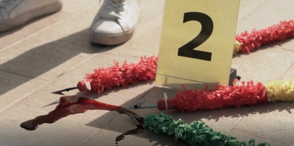 La manifestation s’est poursuivie par la reconstitution symbolique d’une scène de crime. Au sol, des silhouettes symbolisant les victimes et les armes, réelles et non factices, utilisées au cours des corridas pour torturer et mettre à mort les taureaux : une pique (dont nous avons oublié d’enlever le capuchon protecteur !), des banderilles, une épée et un poignard. Au centre, 4 militants-taureaux, habillés en blanc pour symboliser l’innocence et la paix, ont effeuillé, l’un après l’autre, la plainte douloureuse d’un taureau supplicié dans une arène.
