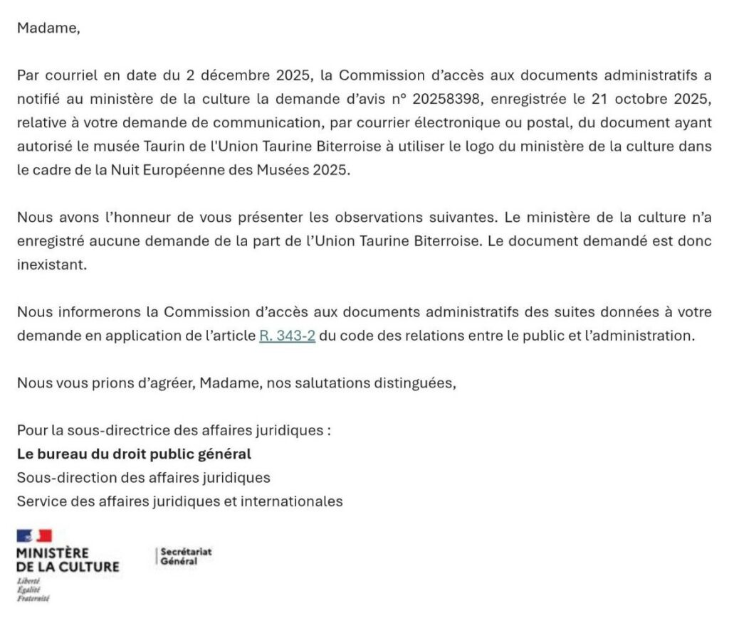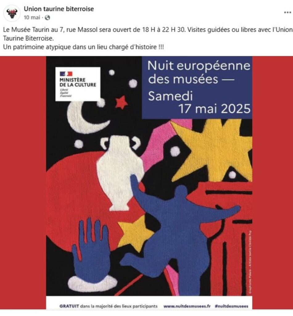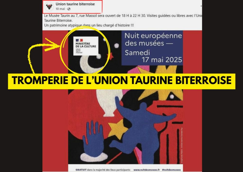 Une tromperie vient d’être mise au jour par le COLBAC concernant la prétendue participation du Musée taurin, dirigé par l’Union Taurine Biterroise (UTB), à la Nuit européenne des musées du 17 mai 2025.