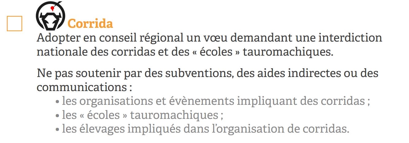 Pour chaque région, les associations nationales L214 Politique et Animaux et PAZ ont invité chaque liste candidate à s’engager sur des mesures visant à améliorer le bien-être animal. Parmi ces mesures, la fin des corridas.