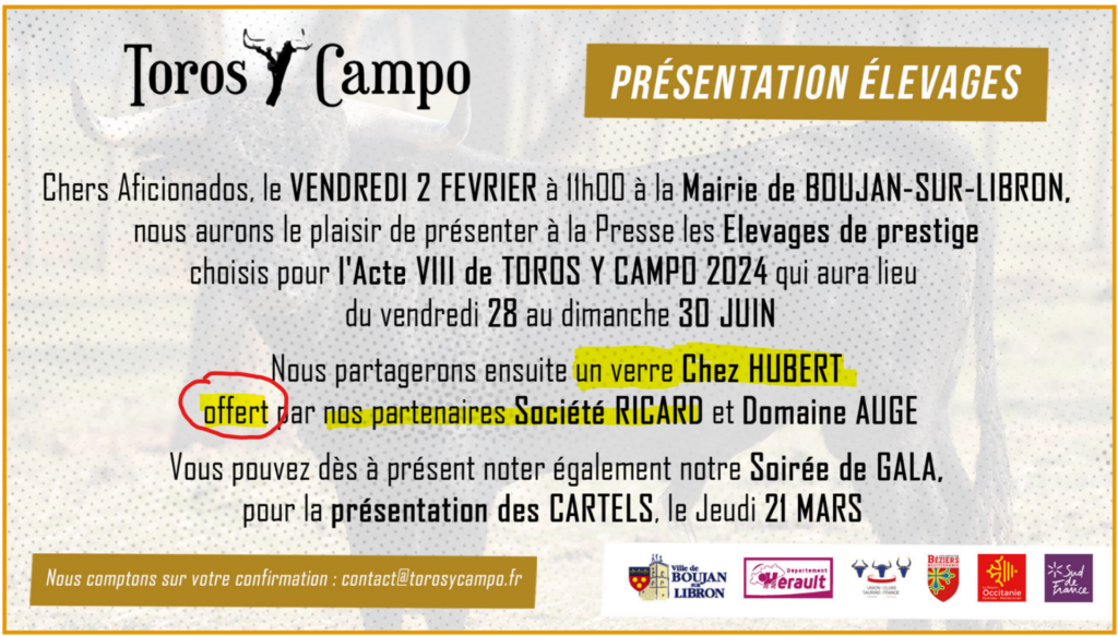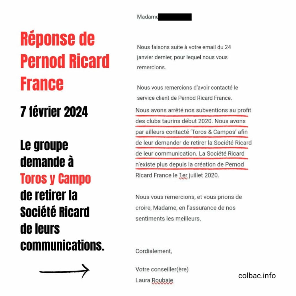 Cependant, une récente publication de Toros y Campo, organisateurs des corridas sanglantes à Boujan-sur-Libron, mentionne un partenariat avec la Société Ricard (qui n’existe plus depuis juillet 2020 !).