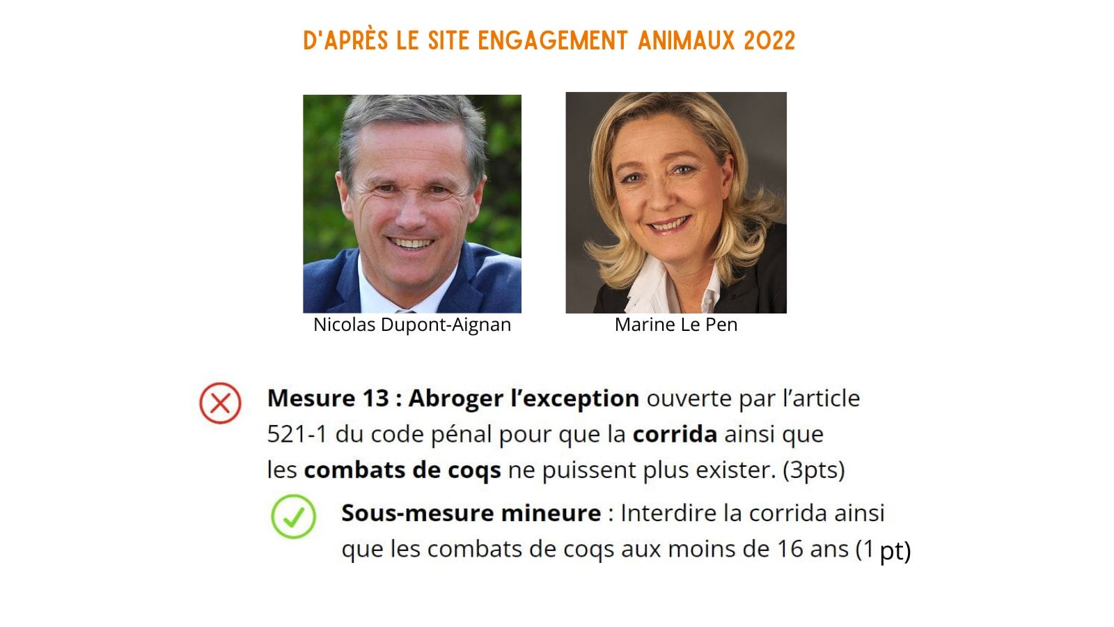 Les candidats Nicolas Dupont-Aignan (DLF) et Marine Le Pen (RN) ne s’engagent pas sur l’abolition mais souhaitent interdire les corridas aux mineurs de moins de 16 ans.