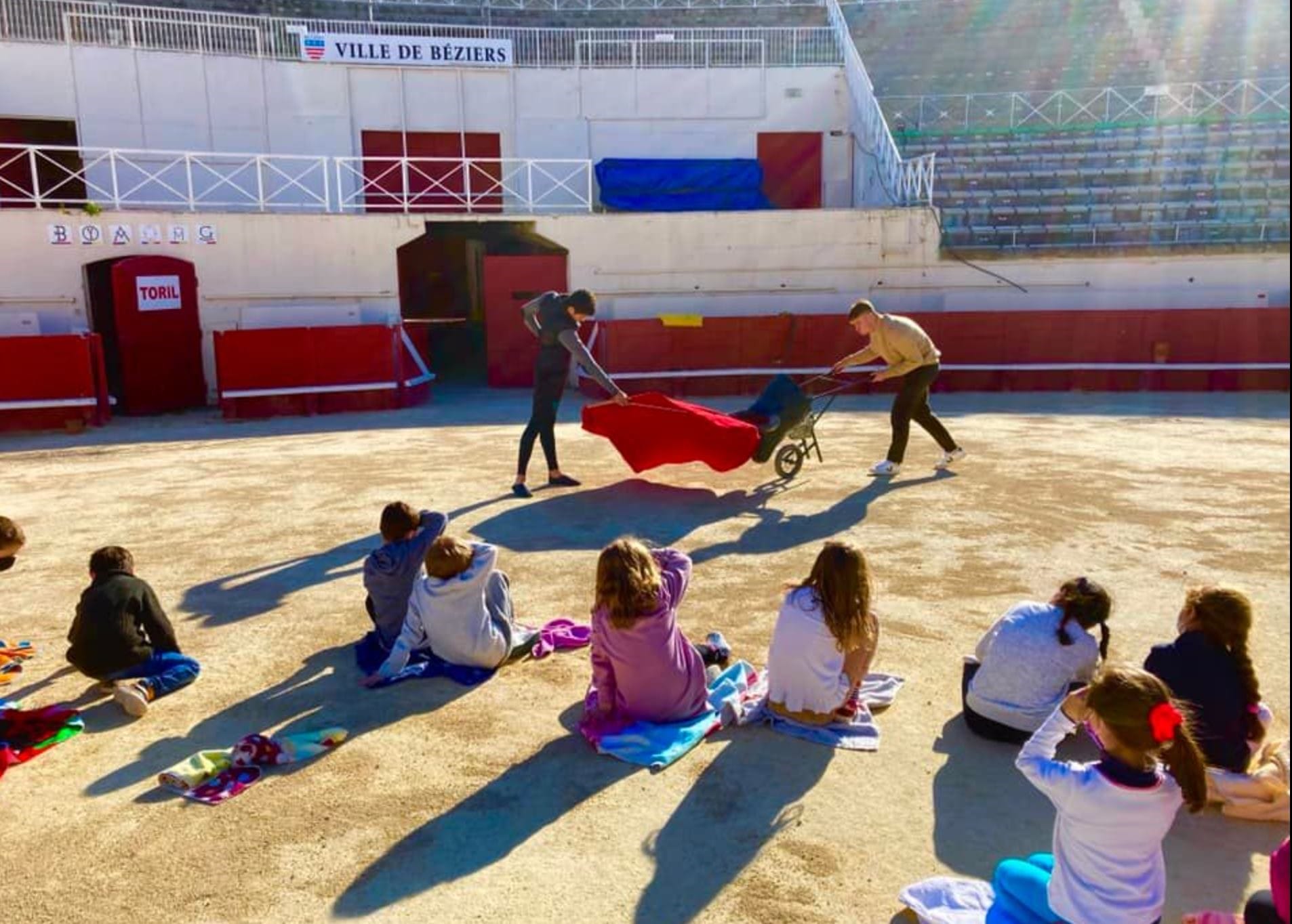 Il s’agissait pour une douzaine d’élèves de CE2 d’imiter les gestes du torero – avec un tissu imprégné de peinture faisant office de muleta – pour réaliser une œuvre de « toreographie ». Les séances ont eu lieu dans les arènes en présence d’un membre de l’école taurine qui a fait une démonstration de « toreo de salon » (gestuelle de la tauromachie) avec un chariot imitant le taureau. Les élèves ont ensuite été reçus au musée taurin.