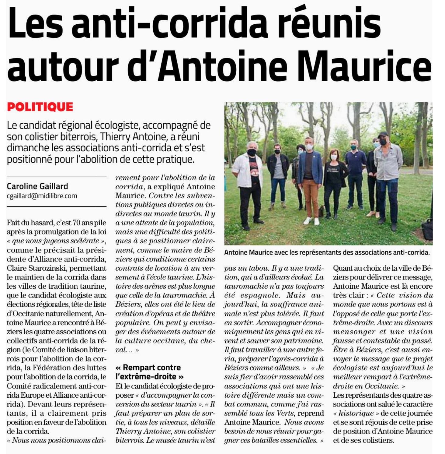 27/04/21 Midi Libre Les anti corrida réunis autour d’Antoine Maurice
