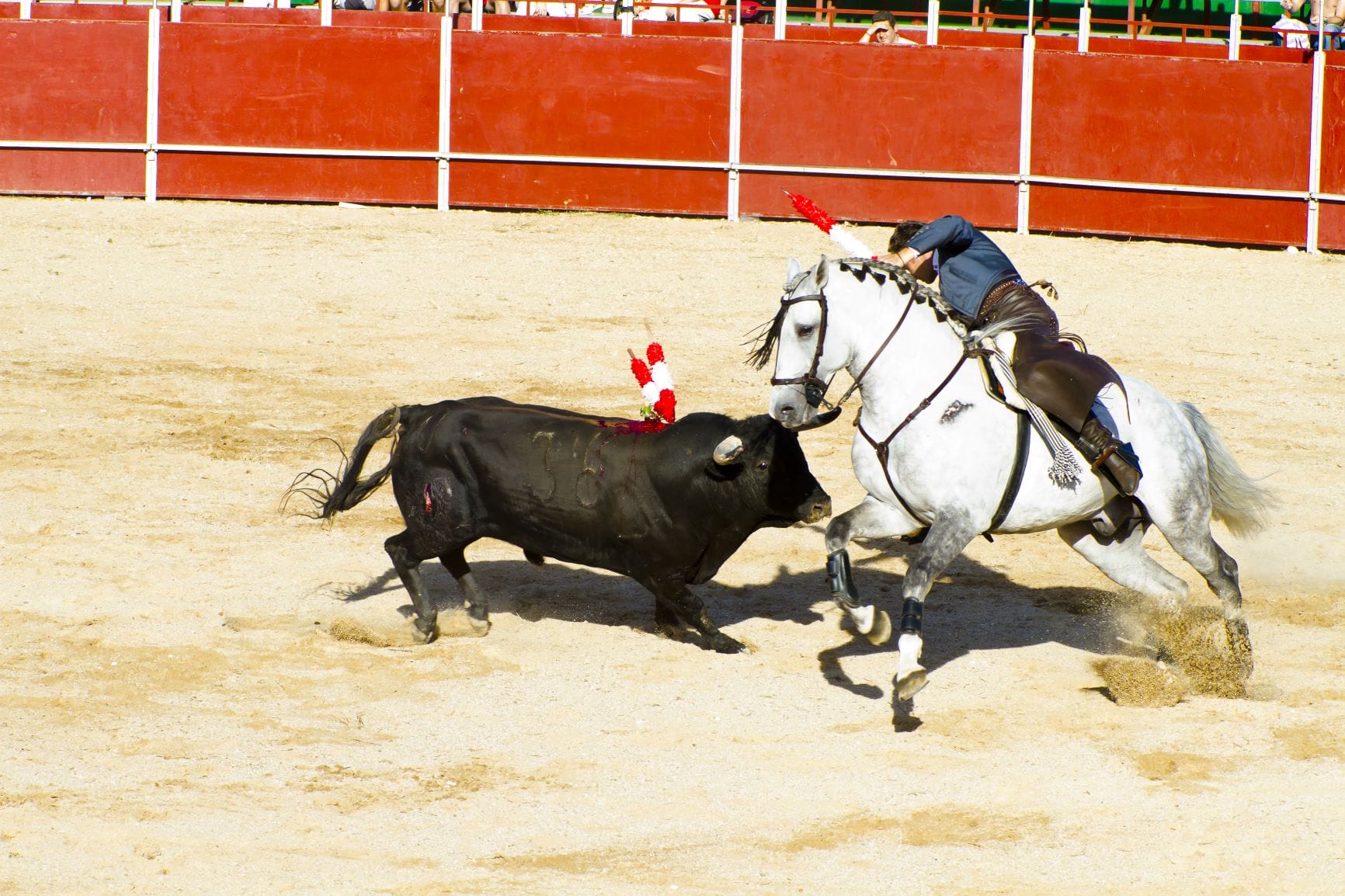 Le cavalier, dit ” rejoneador ” ou ” caballero en plaza “, provoque le taureau en galopant vers lui. Le cheval, dressé à cet effet, esquive de justesse le coup de corne et, pendant que les deux bêtes se frôlent, l’homme en profite pour clouer son arme entre les épaules du bovin.