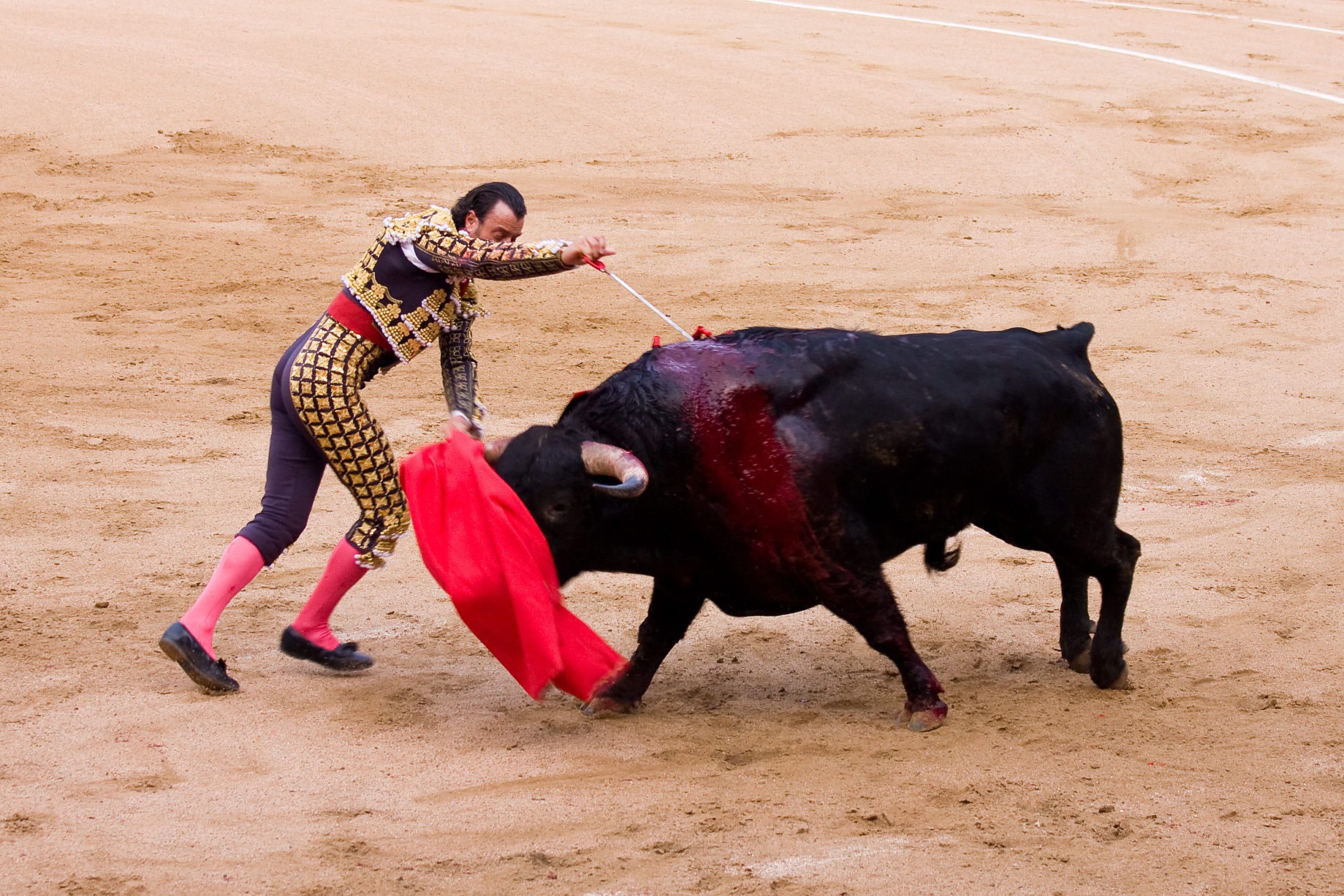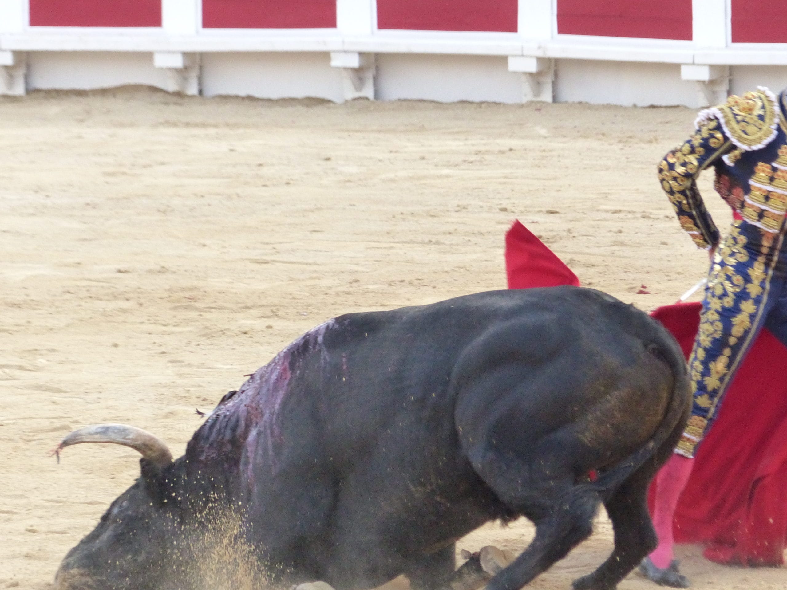 Le matador plonge son épée dans le dos de l’animal déjà martyrisé par les piques et les banderilles. Etant donné que l’homme n’est pas plus grand que l’animal, il ne peut pas plonger son épée verticalement, il ne peut la plonger que sous un angle d’environ 45 degrés et donc la lame n’atteint jamais le cœur. Ainsi la mort n’est jamais foudroyante.