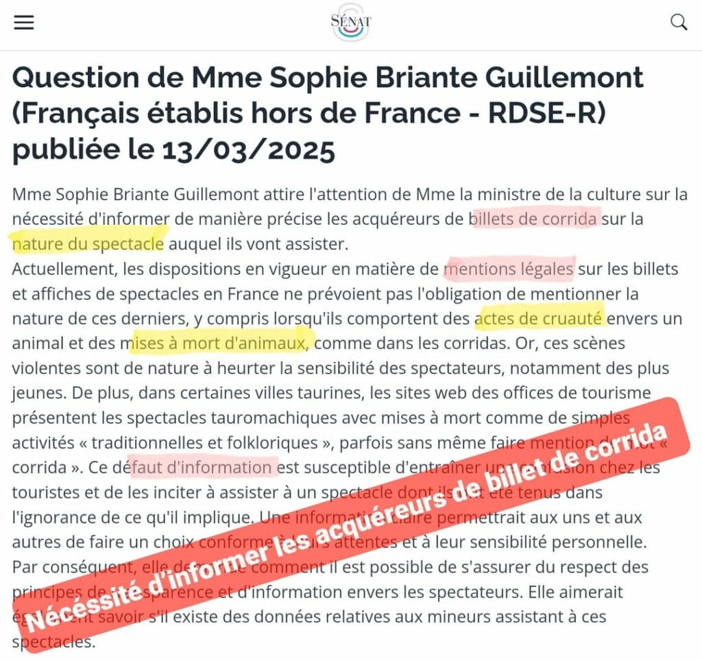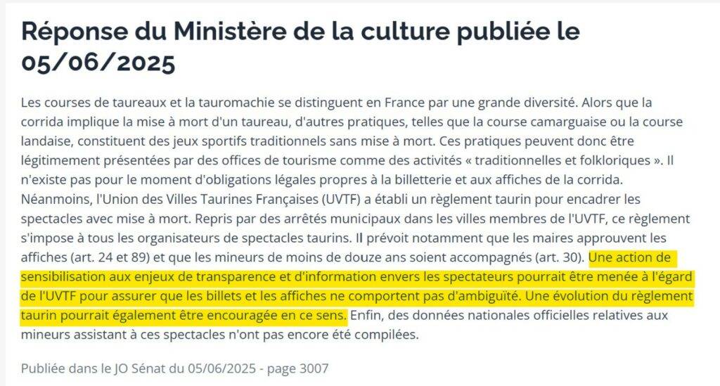 1/En mars, la sénatrice Sophie Briante Guillemont (groupe RDSE) a posé une question écrite au Gouvernement visant à obtenir une signalétique claire sur les billets de corrida, afin que le public soit informé de la nature violente de ces spectacles. Dans sa réponse, la ministre de la Culture a évoqué – c’est inédit ! – la nécessité d’améliorer l’information du public sur la corrida, ainsi que des pistes pour faire évoluer le règlement taurin en ce sens.