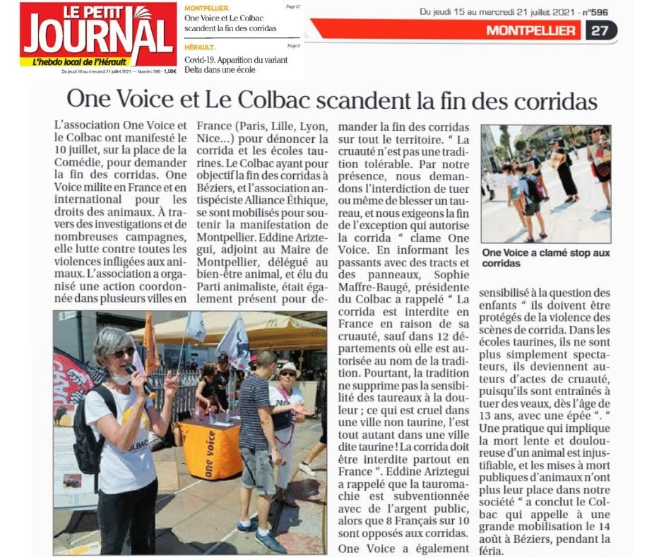 13/07/21 Occitanie Tribune L’association One Voice et le Colbac réclament la fin des corridas en France