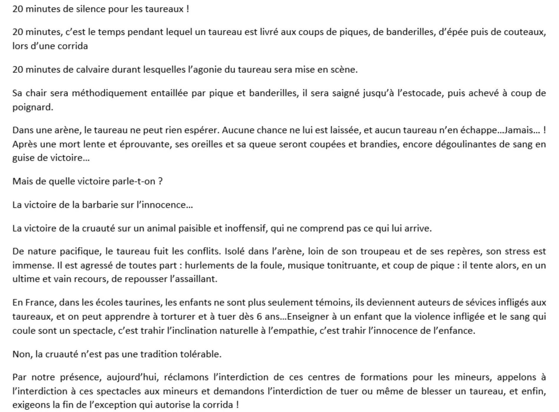 "Vingt minutes de silence pour les taureaux ", un texte de One Voice