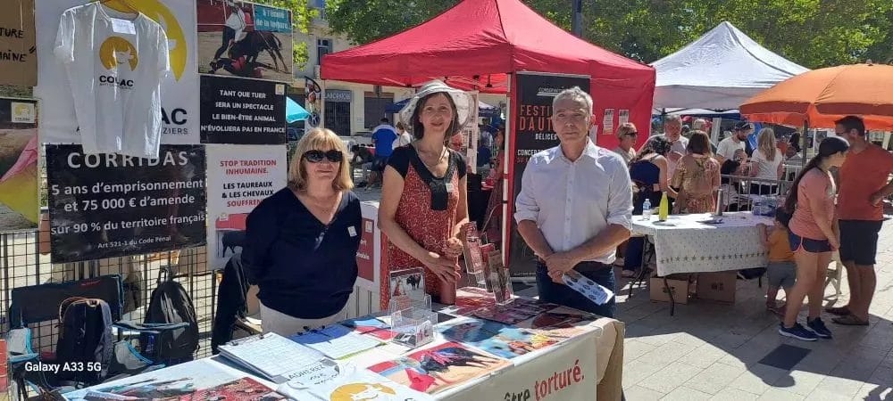 Le COLBAC a une fois de plus participé à la journée « Les associations font les Allées » pour sensibiliser le public à la réalité de la corrida. Nous avons tenu un stand au bas des allées Paul Riquet dès 10 heures du matin le samedi 9 septembre. Malgré le vif succès, les échanges ont révélé un constat : de nombreux citoyens biterrois ne se sentent pas libres d’exprimer publiquement leur opposition à la corrida.