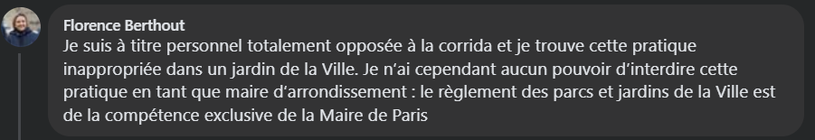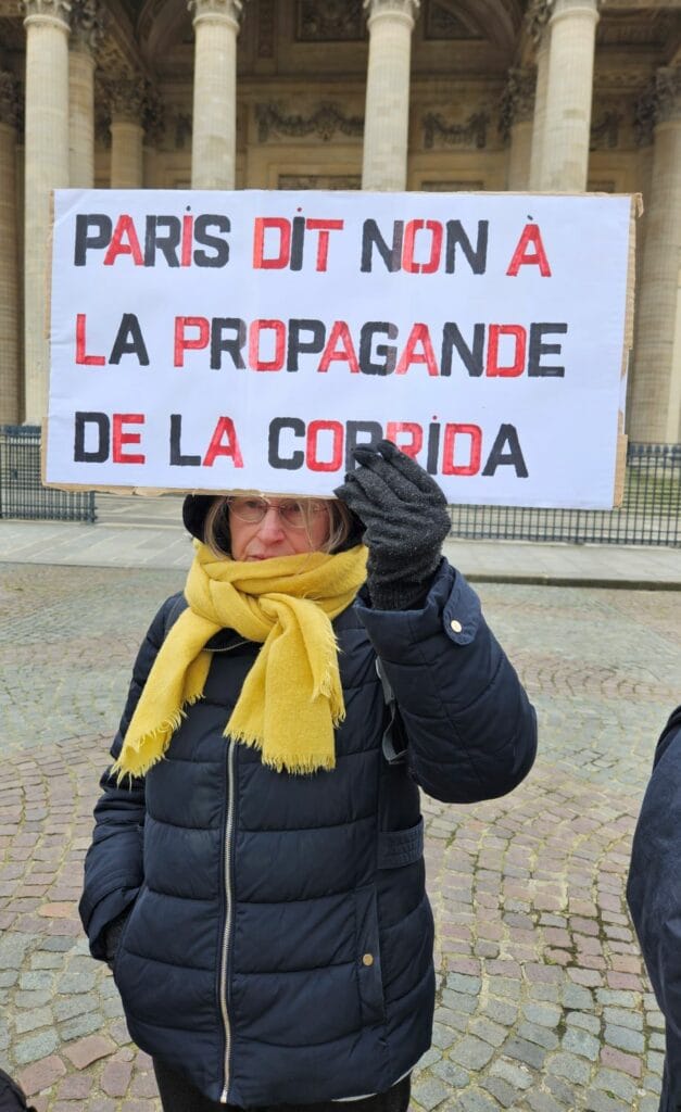 Sophie Maffre-Baugé a rappelé ce qu’est Culturaficion et pourquoi ces entraînements dans l’espace public sont scandaleux. Elle a également dénoncé la généralisation de la promotion de la corrida dans la capitale, soulignant que les aficionados ne se cachent plus et revendiquent ouvertement leur volonté d’« évangéliser » Paris.