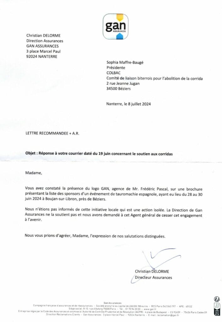GAN Assurances a officiellement démenti avoir apporté un quelconque soutien à la corrida et demande à son agent local, M. Frédéric Pascal, de cesser son soutien aux novilladas de Boujan-sur-Libron.